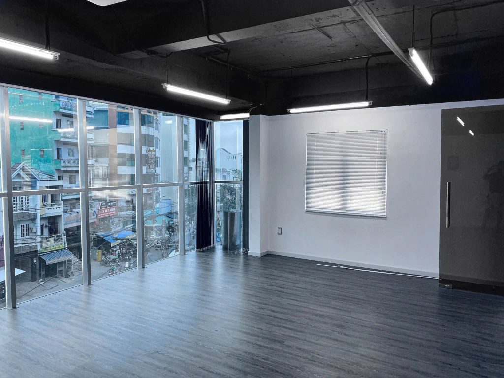 Mỗi văn phòng xây dựng trống suốt, được lát gạch men sáng, mặt trước lắp full kính cường lực có view hướng về cầu Bình Lợi và toàn cảnh đường phố.